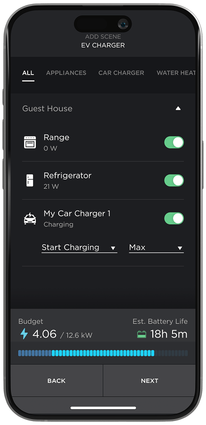 Create custom scenes and let the system optimize your energy usage. The Savant app enables you to set energy scenes within your budget, helping you maximize available power. This ensures your home stays resilient and fully powered, even under changing conditions.
